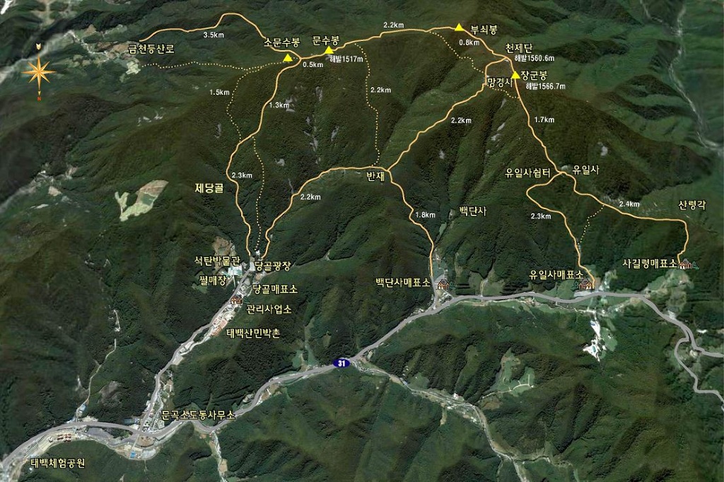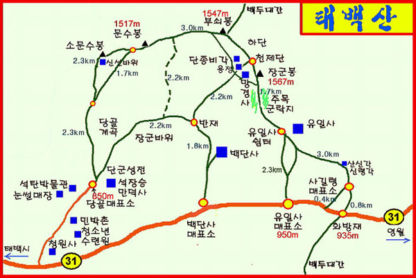 코 스 : 유일사매표소(들머리) - 유일사쉼터 - 망경사갈림길 - 장군봉(1,567m) - 영봉(천제단)