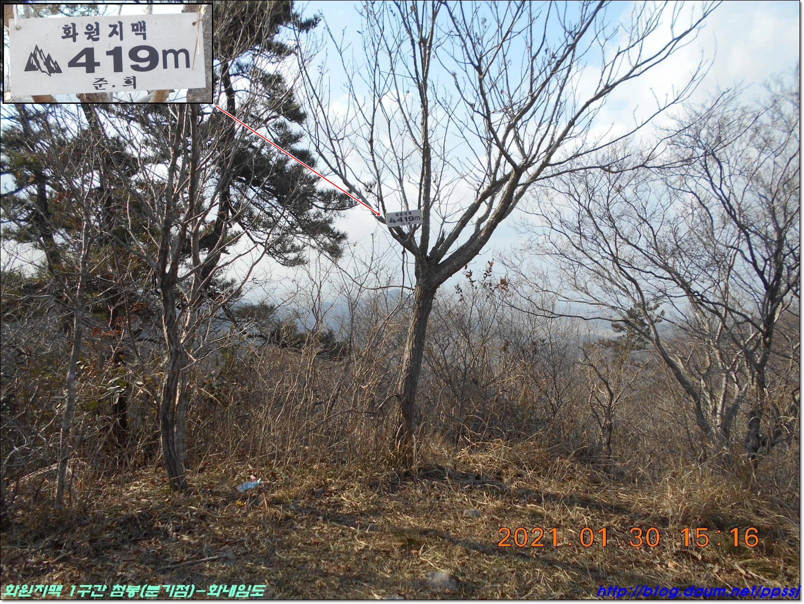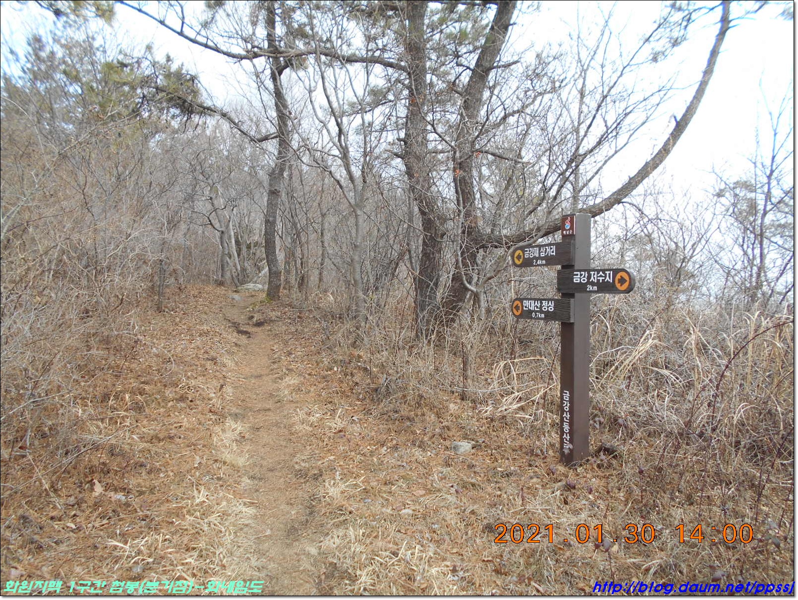 - 만대산(14:20) - 419m봉(15:16) - 헬기장(15:51) - 금강산(16:04) - 화내임도(17:11)
