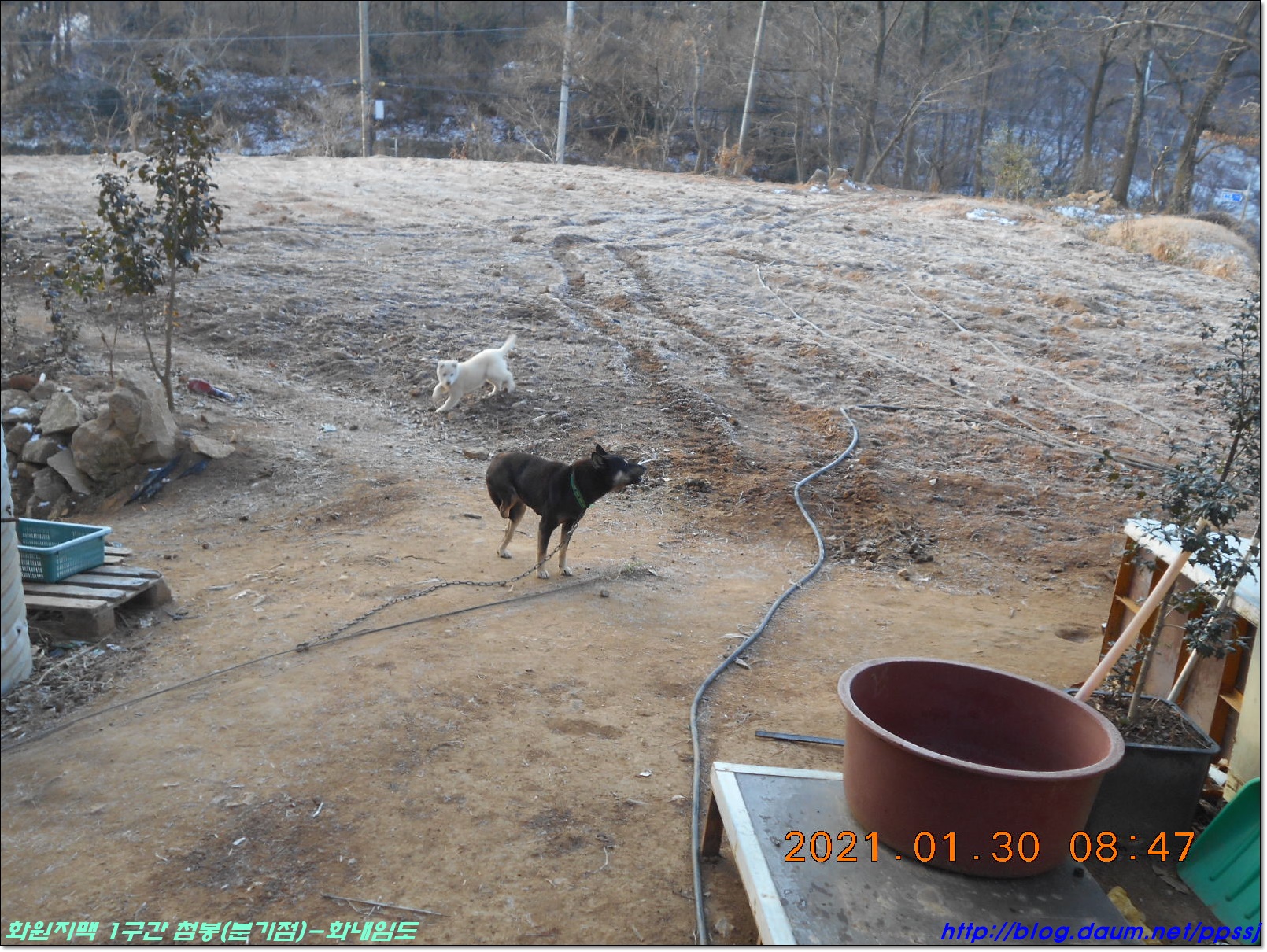 밭을 지키고 있는 개들이 짖어대며 반겨주는데 검둥이 한마리는 뒷다리 하나가 없네요.