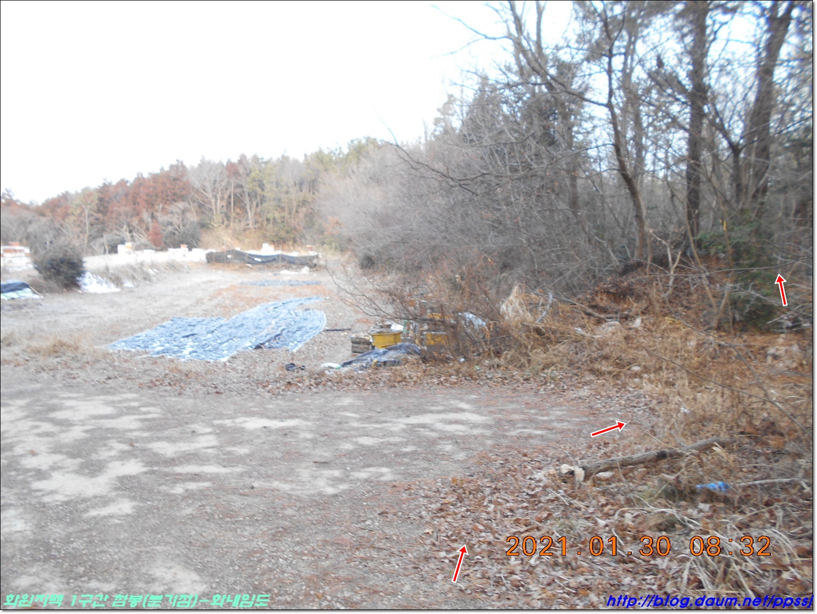 앞쪽에 넓은 공터에 벌통이 보이고 마루금은 우측 숲길로 진행...