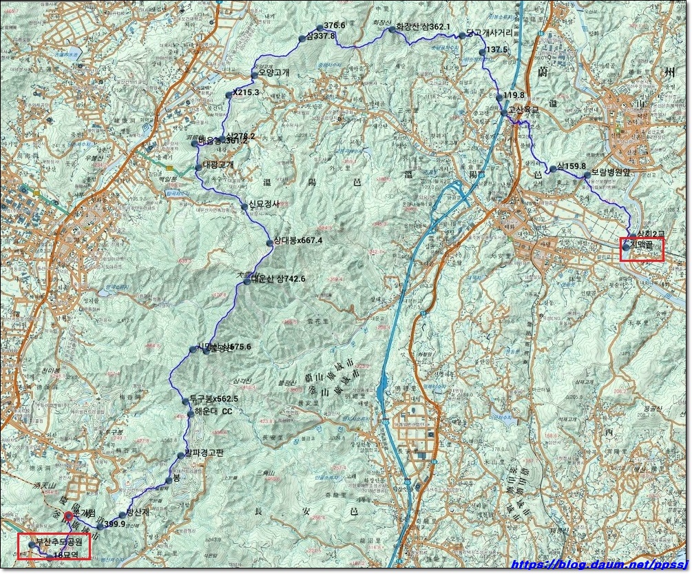 부산추모공원-분기점(488.7m)-널밭재-대운산-오양고개-화장산고산육교-합수점 구간지도