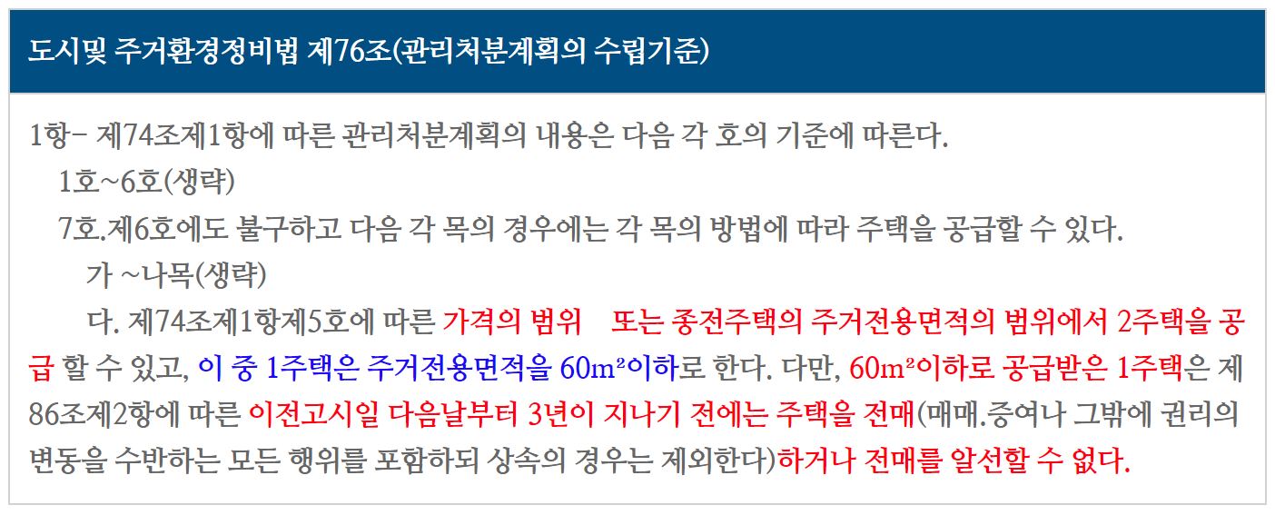 소형주택 3년간 전매제한 금지로 인한 종부세, 이주비 대출 제한 문제등이 발생되어