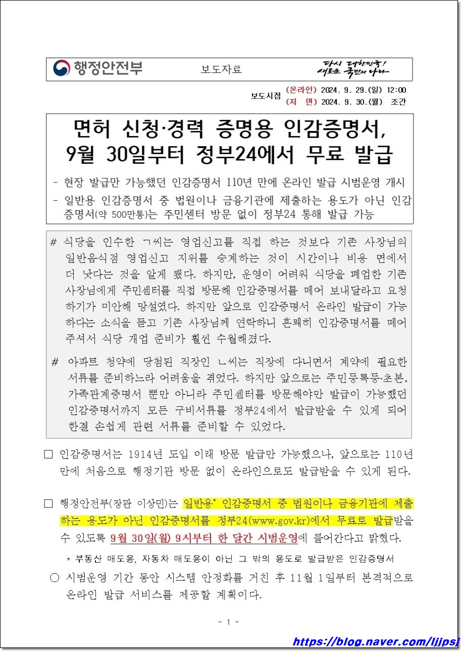 3. 9월30일(월) 09시부터 한 달간 시범 운영 / 정부24 온라인 무료 발급