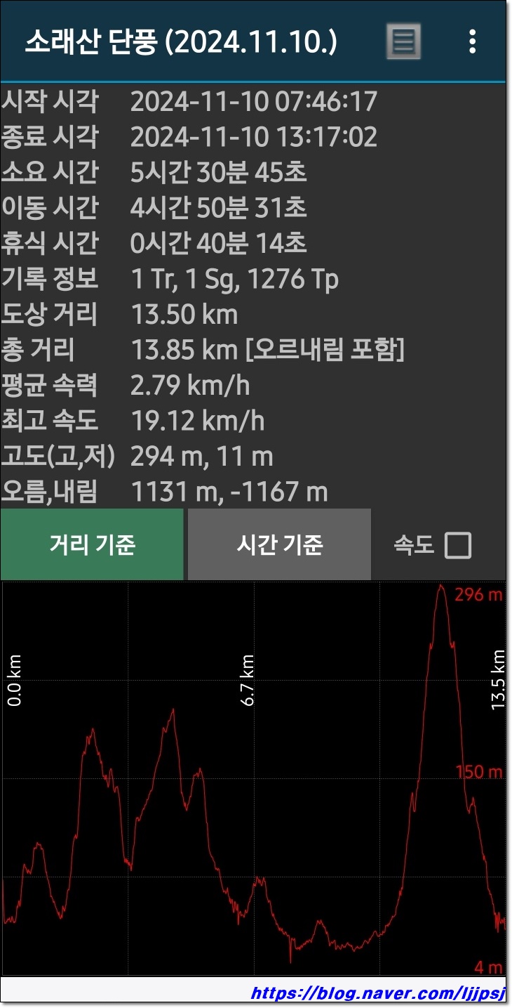 산행거리 : 13.5km (산길샘 실측 거리) / 만의골-인천대공원 탈출거리 2.2km 제외